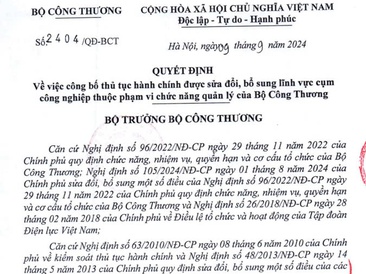 Ngày 09 tháng 9 năm 2024, Bộ Công Thương ban hành Quyết định số 2404/QĐ-BCT về việc công bố thủ tục hành chính (TTHC) được sửa đổi, bổ sung lĩnh vực cụm công nghiệp thuộc phạm vi chức năng quản lý của Bộ Công Thương.
