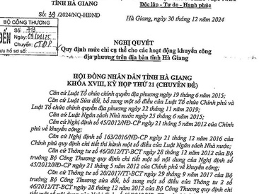 Ngày 30/12/2024, Hội đồng nhân dân tỉnh Hà Giang đã ban hành Nghị quyết số 39/2024/NQ-HĐND quy định mức chi cụ thể cho các hoạt động khuyến công địa phương trên địa bàn tỉnh