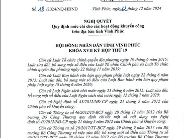 Ngày 12/12/2024, Hội đồng nhân dân tỉnh Vĩnh Phúc đã ký, ban hành Nghị quyết số 18/2024/NQ-HĐND Quy định mức chi cho các hoạt động khuyến công trên địa bàn tỉnh Vĩnh Phúc.